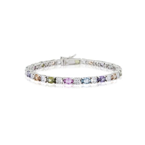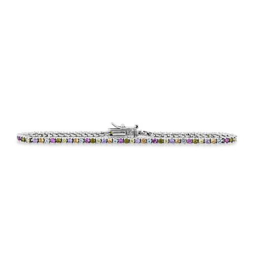 Bracciale tennis Rainbow in Ag925 rodiato con pietre taglio brillante multicolor simulanti le semipreziose ametista, peridoto, topazio, topazio azzurro e tormalina rosa da 2mm ognuna, montate su castoni a griffe con quattro punte. Chiusura con molla ed un otto di sicurezza.