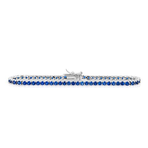 Bracciale tennis classico in Ag925 rodiato con pietre taglio brillante simulanti lo zaffiro da 0,05 carati ognuna, montate su castoni a griffe con quattro punte, chiusura con molla e un otto di sicurezza. Ottima manifattura del bracciale.