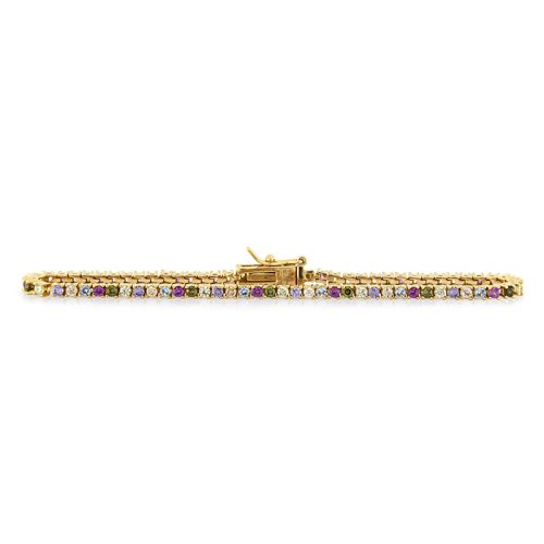 Bracciale tennis Rainbow in Ag925 placcato Oro giallo 18kt, con pietre taglio brillante multicolor simulanti le semipreziose ametista, peridoto, topazio, topazio azzurro e tormalina rosa da 2mm ognuna, montate su castoni a griffe con quattro punte. Chiusura con molla ed un otto di sicurezza.