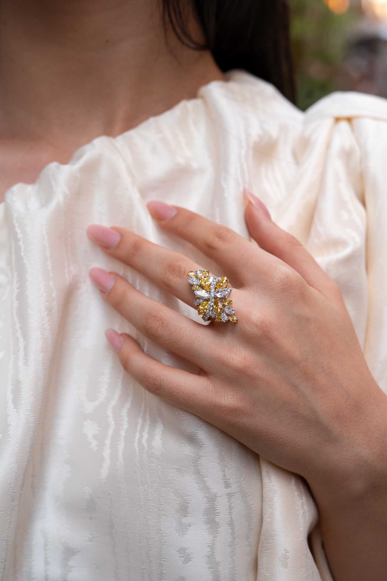 Anello Classico in Ag925 rodiato, con pietre di taglio marquise di varie dimensioni che simulano il diamante classico ed il diamante fancy giallo, con una fila armonica di pietre taglio brillante al centro e con gambo liscio.