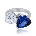 Anello classico contarie Blue Moon in Argento 925 rodiato, con due pietre taglio cuore da 4 carati ognuna, simulante lo zaffiro blu ceylon e simulante il diamante, montate su castoni con tre punte a filo e con gambo liscio.