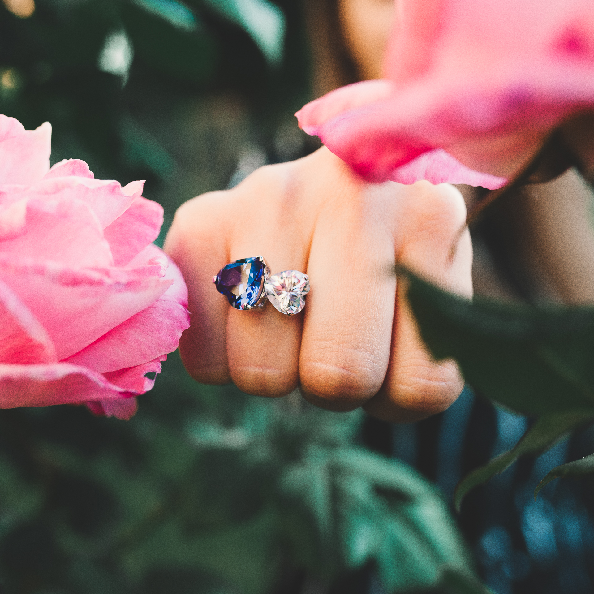 Anello classico contarie Blue Moon in Argento 925 rodiato, con due pietre taglio cuore da 4 carati ognuna, simulante lo zaffiro blu ceylon e simulante il diamante, montate su castoni con tre punte a filo e con gambo liscio.