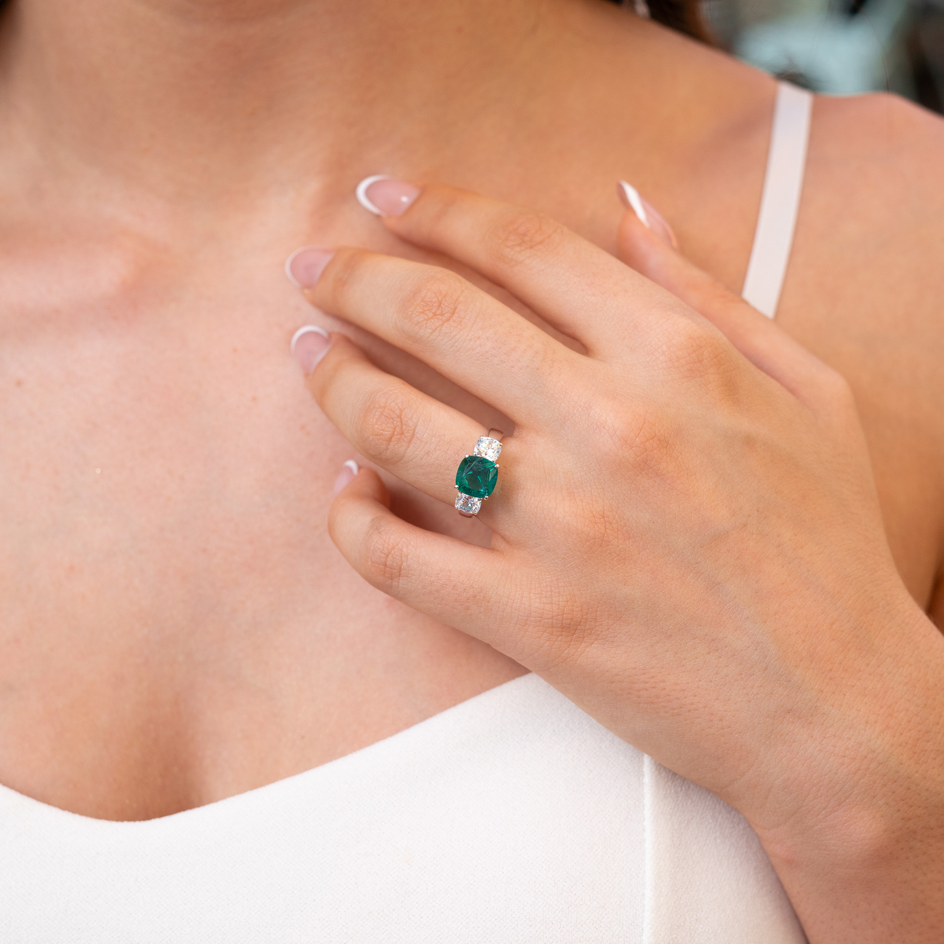 Anello classico 3 pietre in Argento 925 rodiato, con pietra centrale taglio cuscino quadrato simulante lo smeraldo da 3 carati, ai lati due pietre taglio brillante simulanti il diamante da 0,50 carati ognuna, montate su castoni con quattro punte a filo e con gambo liscio.