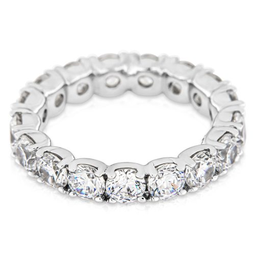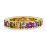 Anello eternity multicolor in Ag925 placcato Oro giallo 18kt con pietre taglio brillante simulanti le pietre semipreziose ametista, peridoto, topazio, topazio azzurro e tormalina rosa da 0,25 carati ognuna, montate su castoni a griffe con quattro punte.
