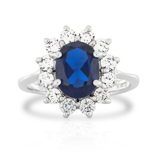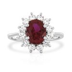 Anello Kate Rubino Rosso, classico margherita in Argento 925 rodiato, con pietra taglio ovale simulante il rubino rosso da 3 carati e contorno di pietre taglio brillante simulanti il diamante da 0,05 carati ognuna, montate su castoni con quattro punte a filo e con gambo liscio.