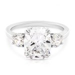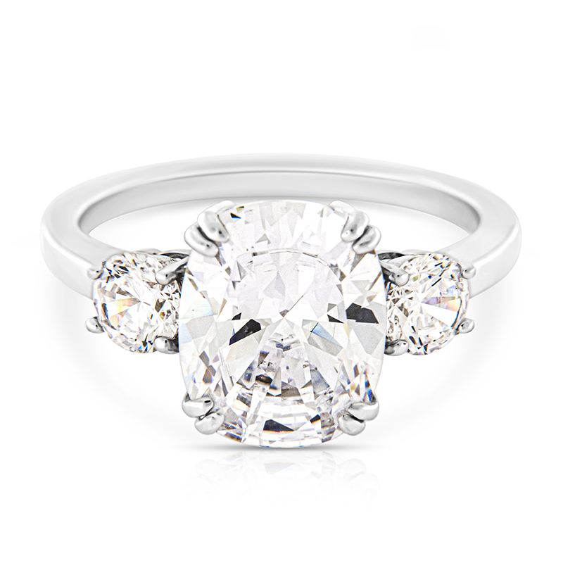 Anello classico 3 pietre in Argento 925 rodiato, con pietra centrale taglio cuscino simulante il diamante da 6 carati, ai lati due pietre taglio brillante simulanti il diamante da 0,50 carati ognuna, montate su castoni con quattro punte a filo, doppie sulla pietra centrale e classiche sulle laterali, con gambo liscio.