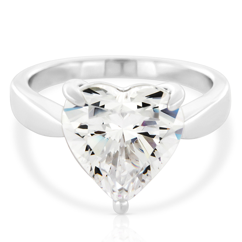 Anello solitario Heart in Ag925 rodiato, con una pietra taglio cuore, simulante il diamante da 8 carati e circa 12mm, montata su un castone con tre punte a filo e gambo liscio.