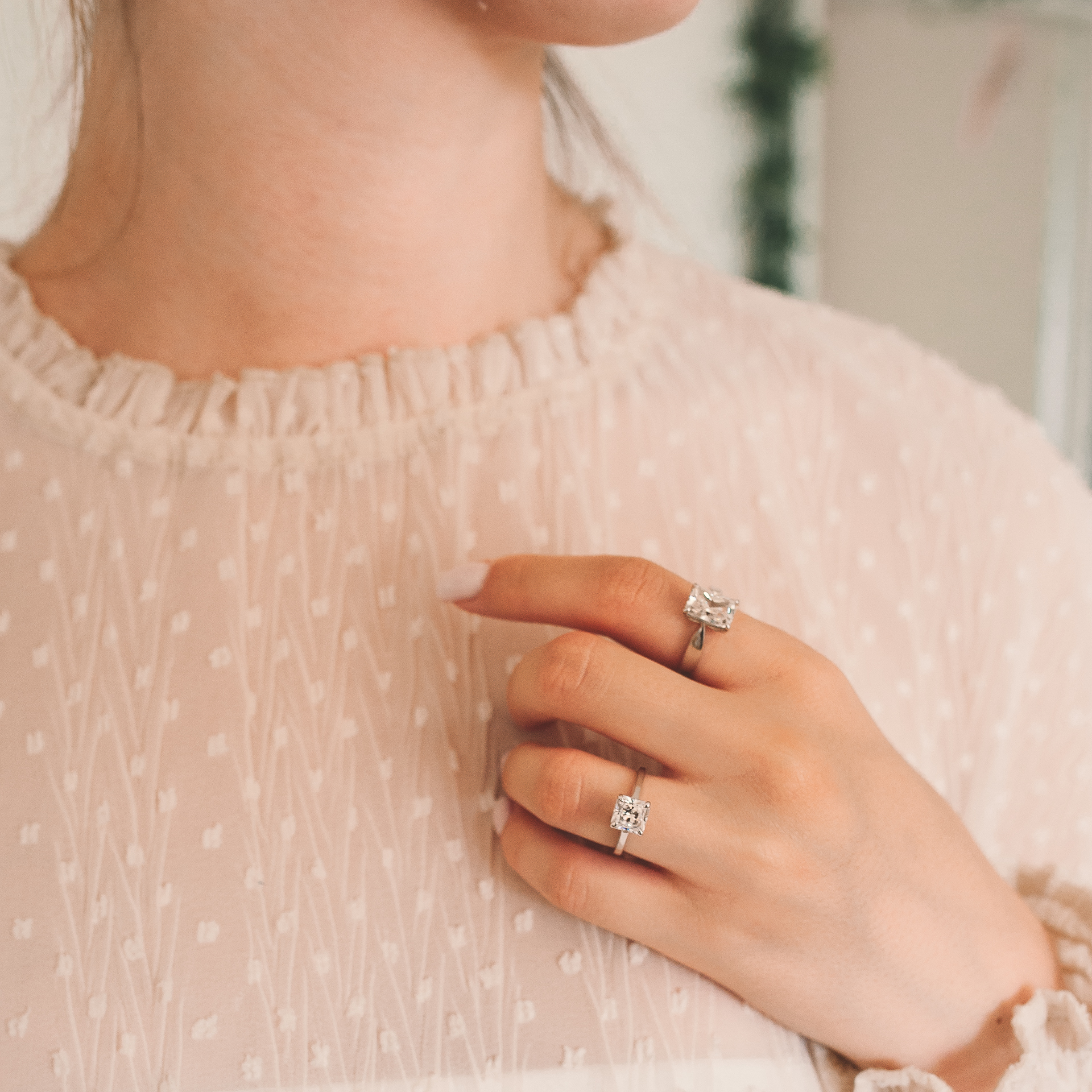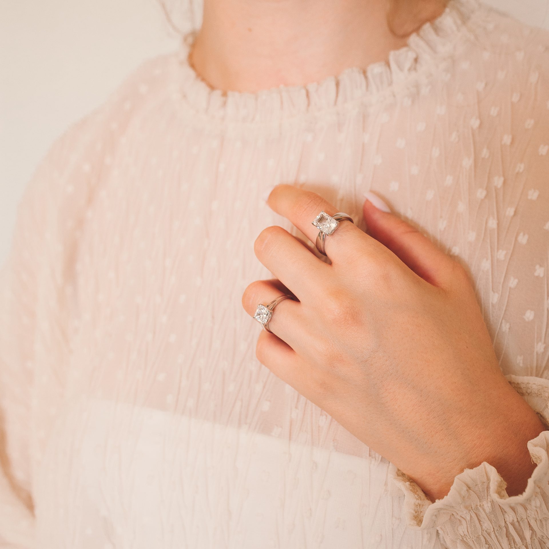 Anello solitario Princess 4 carati, in Ag925 rodiato, con una pietra taglio princess, simulante il diamante da 4 carati, montata su un castone con quattro punte a filo e gambo liscio.