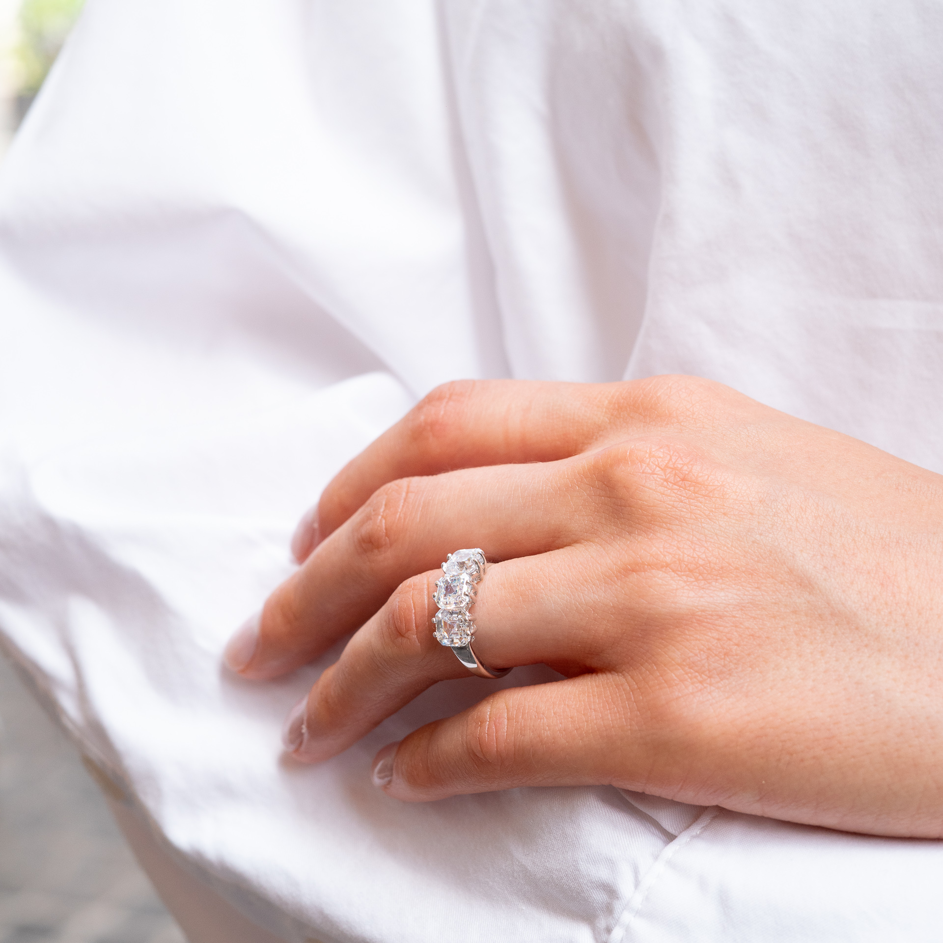 Anello trilogy asscher in Ag925 rodiato con 3 pietre taglio asscher da 1 carato simulanti il diamante, montate su castoni con 4 griffe a filo e con gambo liscio.