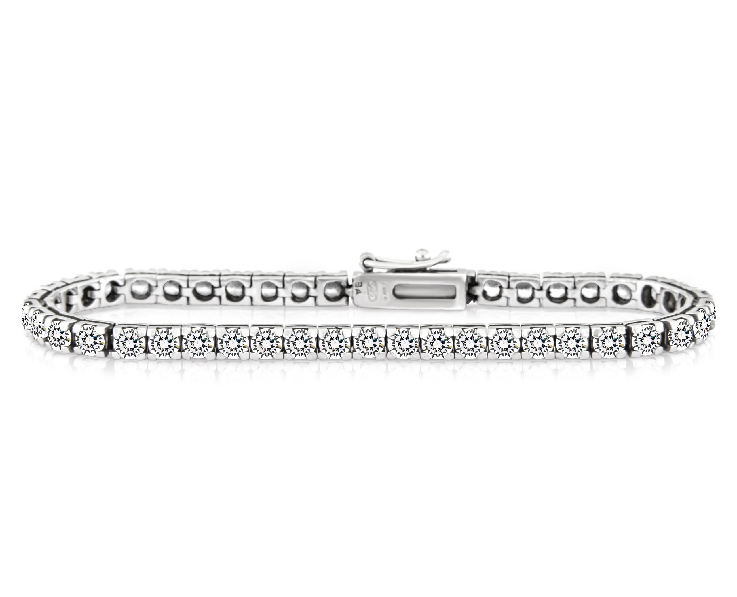Bracciale tennis Piramide diamante 3mm, in Ag925 rodiato con pietre taglio brillante simulanti il diamante da 0,10 carati ognuna, montate su castoni con quattro punte diagonali che formano una piramide e con un otto di sicurezza. Eccellente manifattura del bracciale, giusto connubio tra robustezza del bracciale ed estetica.