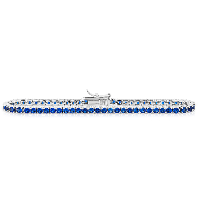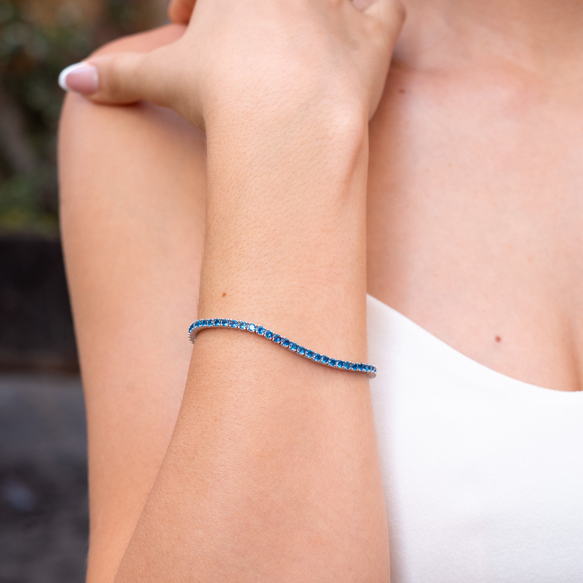 Bracciale tennis classico in Ag925 rodiato con pietre taglio brillante simulanti lo zaffiro da 0,05 carati ognuna, montate su castoni a griffe con quattro punte, chiusura con molla e un otto di sicurezza. Ottima manifattura del bracciale.