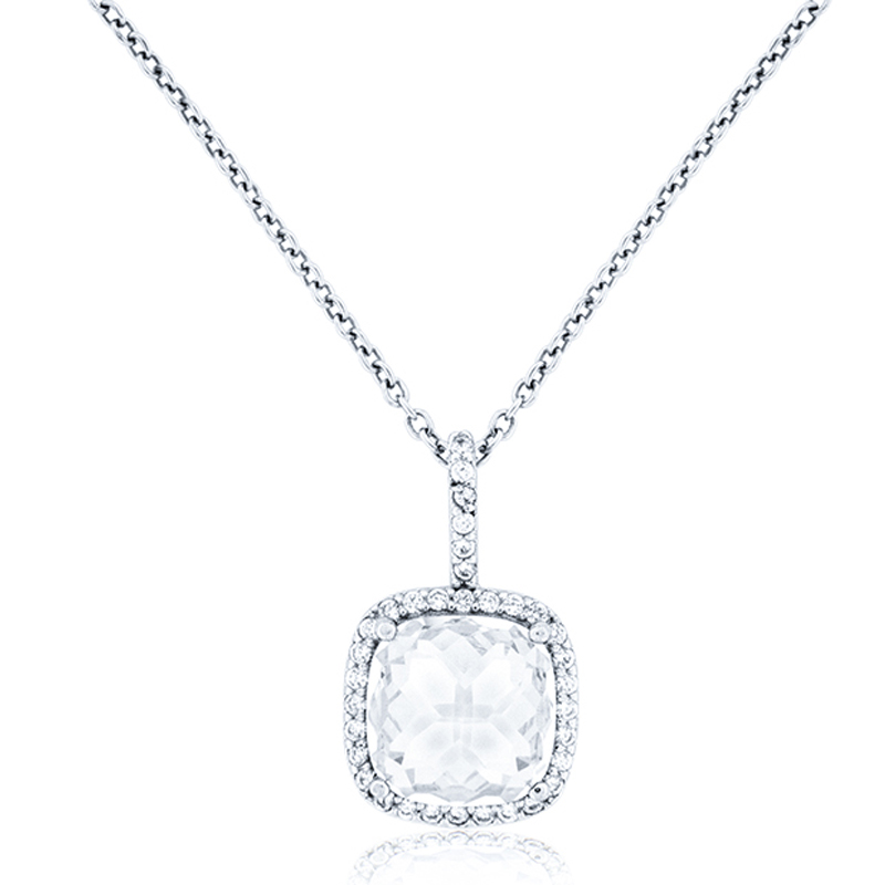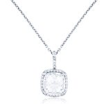 Catenina girocollo punto luce Halo in Ag925 rodiato, con pietra quadrata taglio briolè da 10mm, montata su un castone con quattro punte a filo ed intorno pavè di piccole pietre taglio brillante, tutte simulante il diamante, lunghezza catenina 42cm.