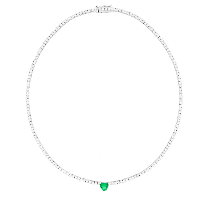 Collana tennis in Ag925 rodiato, con pietra taglio cuore simulante lo smeraldo verde da 1 carato e con pietre taglio brillante simulanti il diamante da 0,05 carati ognuna, montate su castoni a griffe con quattro punte, chiusura con molla e con un otto di sicurezza. Lunghezza collana 42cm.