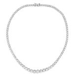 Collana tennis degradé in Ag925 rodiato, con pietre a gradazione di taglio brillante simulanti il diamante da 0,10 fino ad 1 carato, montate su castoni a griffe con quattro punte, chiusura con un otto di sicurezza, lunghezza collana 42cm.