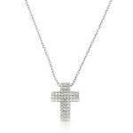 Catenina girocollo croce in Ag925 rodiato con 3 file di pietre taglio brillante simulanti il diamante, montate a pavè, con aggiornatura posteriore. Dimensione croce 15x12mm e lunghezza catenina 42cm.