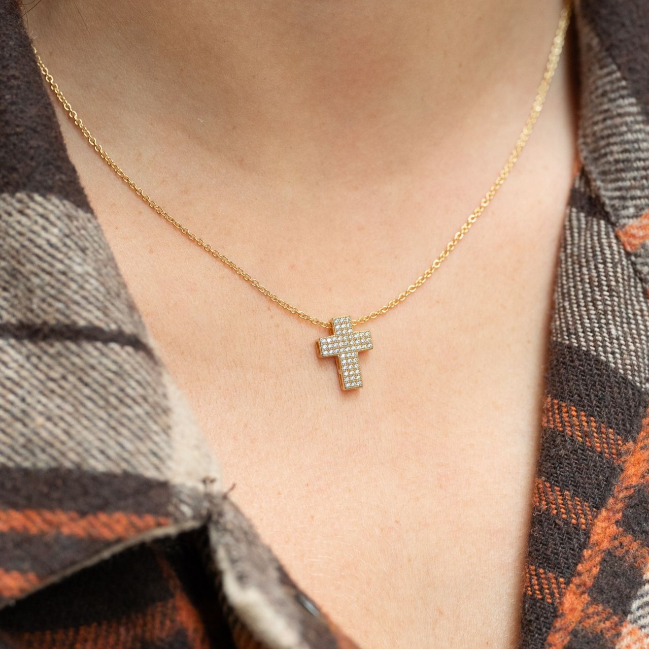 Catenina girocollo croce in Ag925 placcato Oro giallo 18kt con 3 file di pietre taglio brillante simulanti il diamante, montate a pavè, con aggiornatura posteriore. Dimensione croce 15x12mm. Lunghezza catenina 42cm.