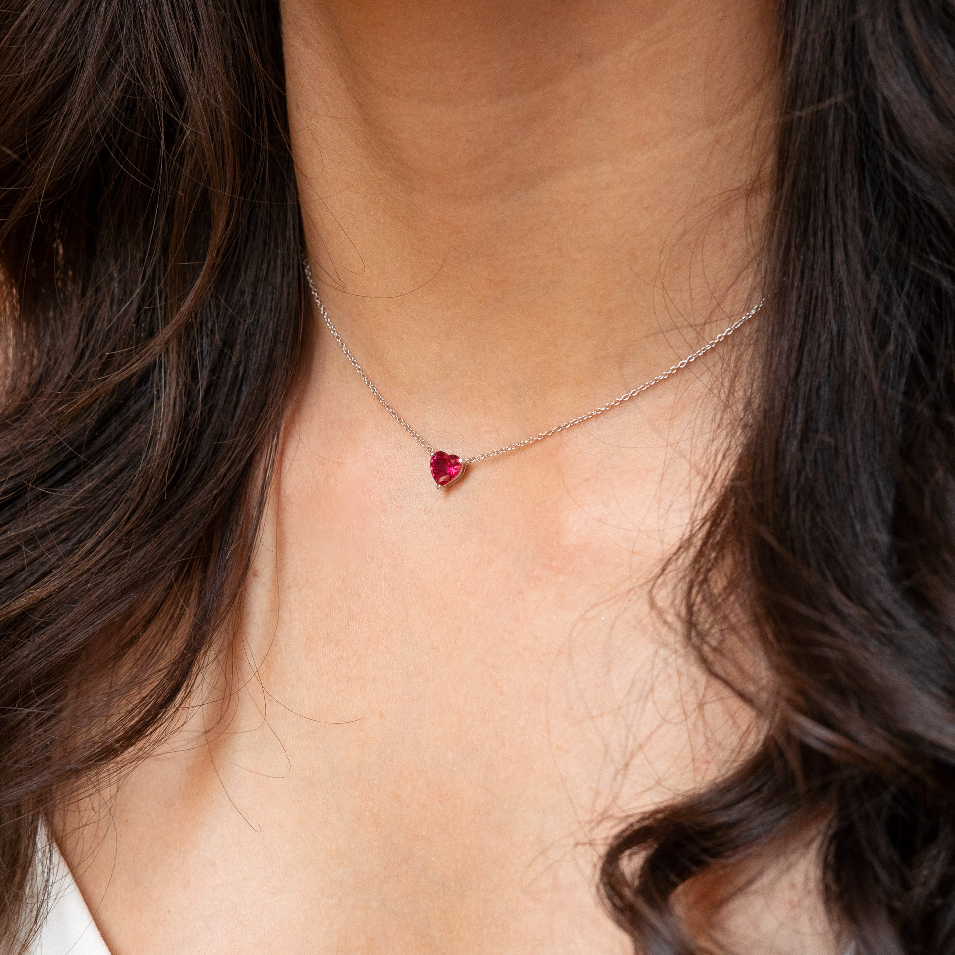 Girocollo Cuore Rubino 1,50 carati, in Ag925 rodiato con pietra taglio cuore simulante il rubino da 1,50 carati, montata su castone con griffe a filo. Dimensione cuore 7mm e lunghezza catenina 42cm.