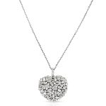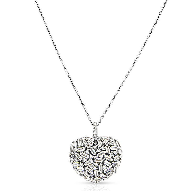 Catenina girocollo cuore bombato in Ag925 rodiato, con pietre taglio baguette simulanti il diamante, montate a pavè, con aggiornatura posteriore. Dimensione cuore 24x21mm e lunghezza catenina 42cm.