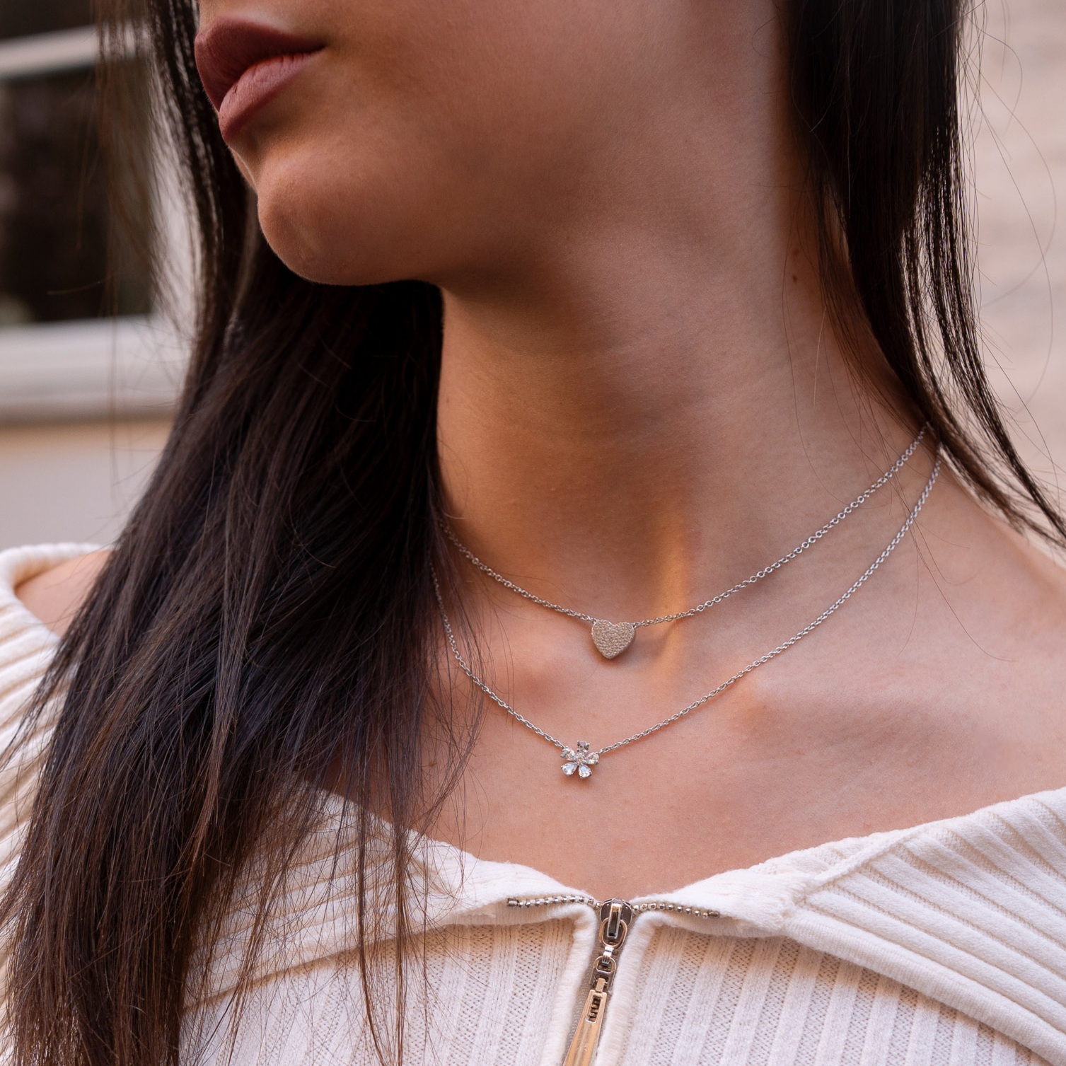 Catenina girocollo cuore in Ag925 rodiato con pietre taglio brillante simulanti il diamante, montate a pavè, con aggiornatura posteriore. Dimensione cuore 10x11mm e lunghezza catenina 42cm.