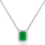 Girocollo Halo baguette smeraldo pavè, in Argento 925 rodiato, ciondolo con pietra taglio baguette simulante lo smeraldo verde da 2 carati e contorno pavè di pietre taglio brillante simulanti il diamante. Lunghezza catenina 42cm.
