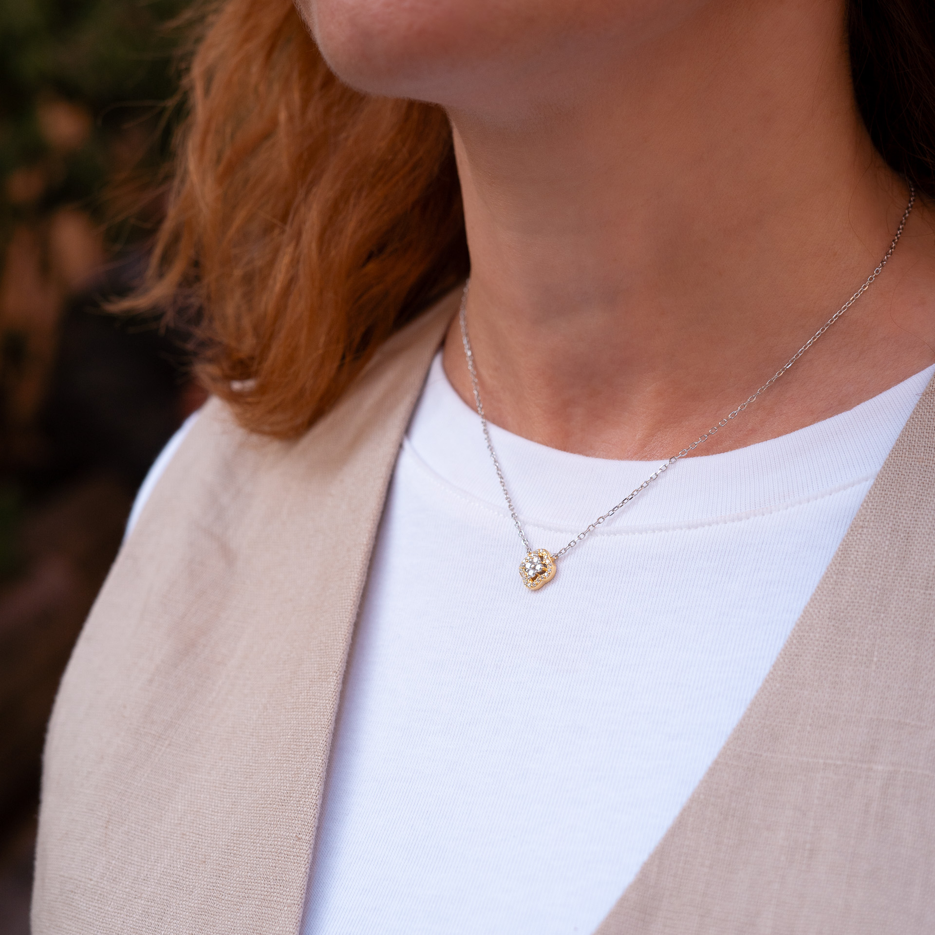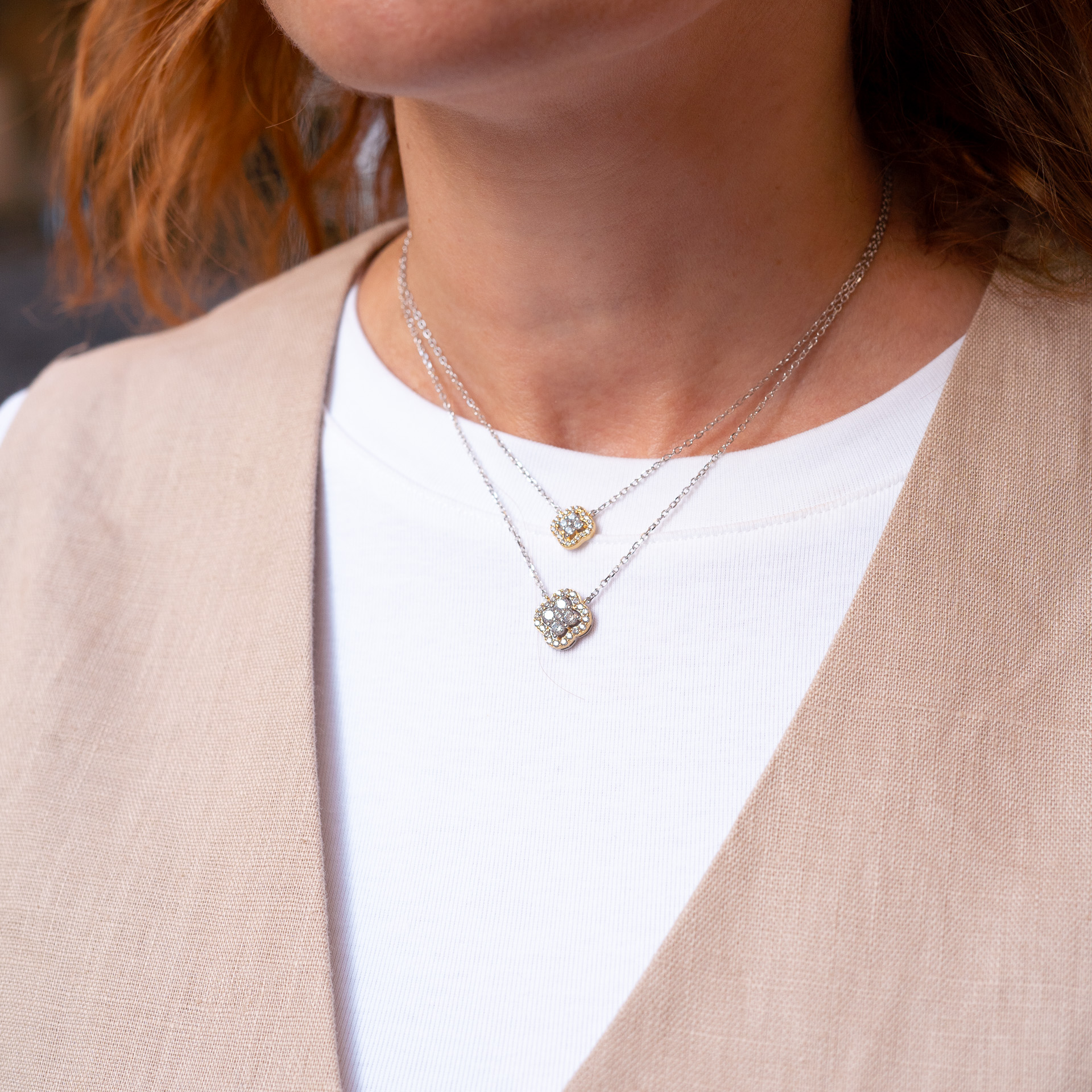 Catenina girocollo con quadrifoglio bicolore in Argento 925 rodiato, composto da pietre taglio brillante simulanti il diamante di varie dimensioni. Quadrifoglio da 9mm e lunghezza catenina 42cm.