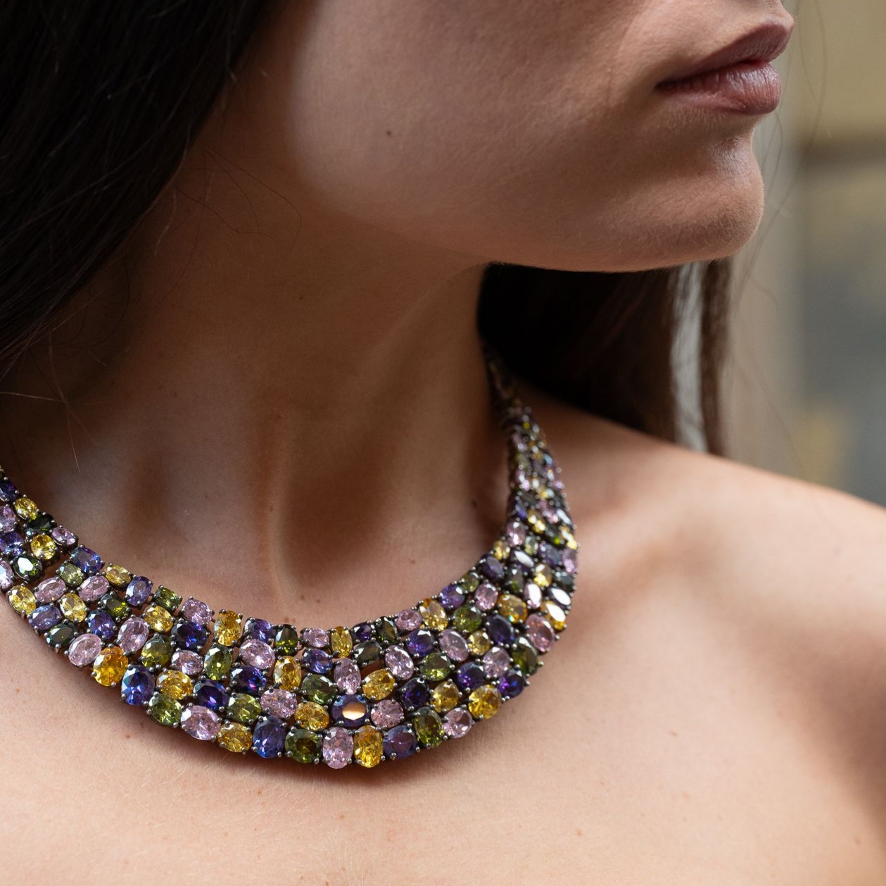 Girocollo Queen multicolor, in Argento 925 rodiato, composto da pietre multicolor idrotermali di taglio ovale che simulano lo zaffiro giallo, l’ametista, la tormalina rosa ed il peridoto. Le pietre sono incastonate a gradazione in verticale ed orizzontale formando un’armonia di colori per il tuo evento speciale. Lunghezza 42cm.