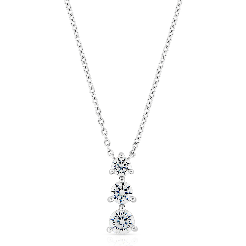 Girocollo trilogy degradè 1 carato, in Ag925 rodiato con 3 pietre taglio brillante simulanti il diamante da 0,50, 0,30 e 0,20 carati per un totale di 1 carato, montate su castoni con punte a filo. Lunghezza catenina 42cm.