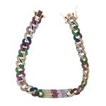 Groumette rosa barretta multicolor, placcato Oro Rosa 18kt e decorato su tutta la sua lunghezza con un pavé multicolor montato su maglia groumette da 8mm, con una barretta centrale anch’essa con pavé. Rappresenta un gioiello vivace e raffinato.