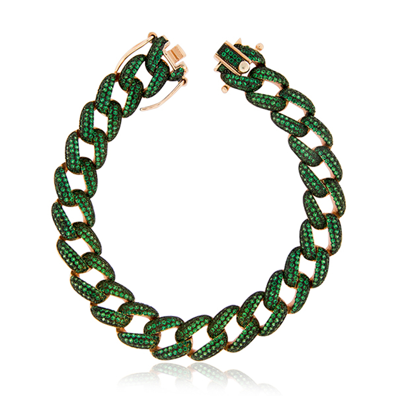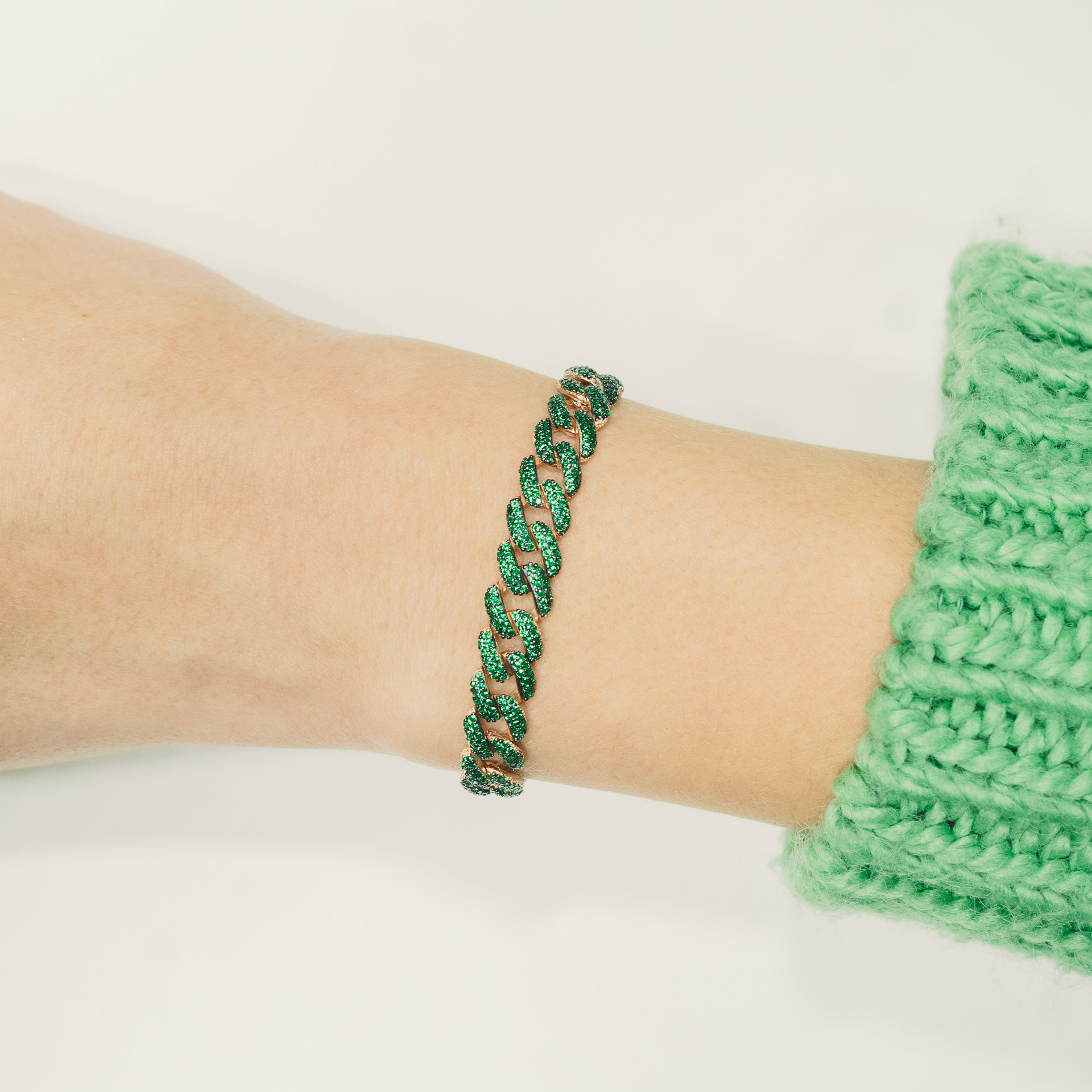 Bracciale groumette verde rosato, in Ag925 placcato Oro Rosa 18kt, con maglia Groumette da 10mm e decorato con un pavé di pietre simulanti lo smeraldo su tutta la sua lunghezza, rappresenta un gioiello vivace e raffinato.