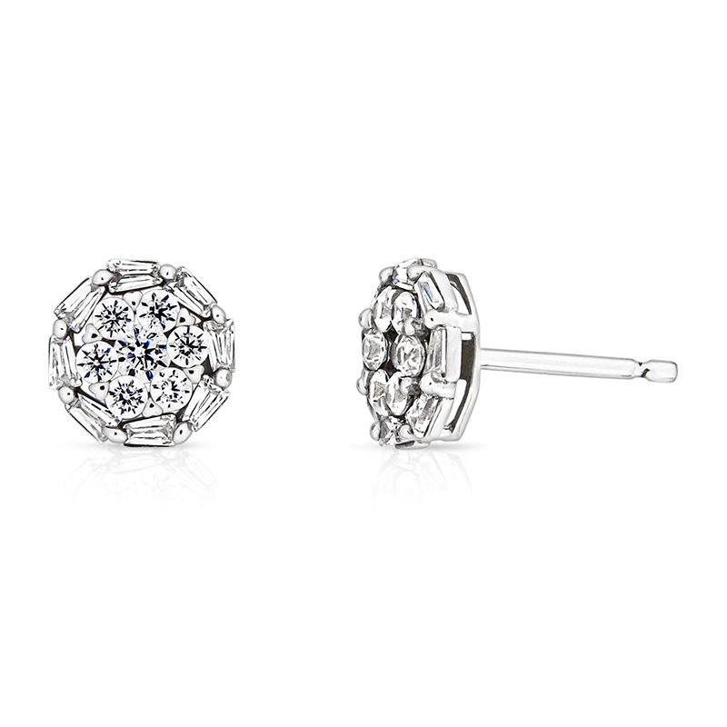 Orecchino halo fiore diamante in Ag925 rodiato, con al centro pietre taglio brillante e nel contorno pietre taglio baguette, tutte simulanti il diamante con perno. Dimensione 9mm