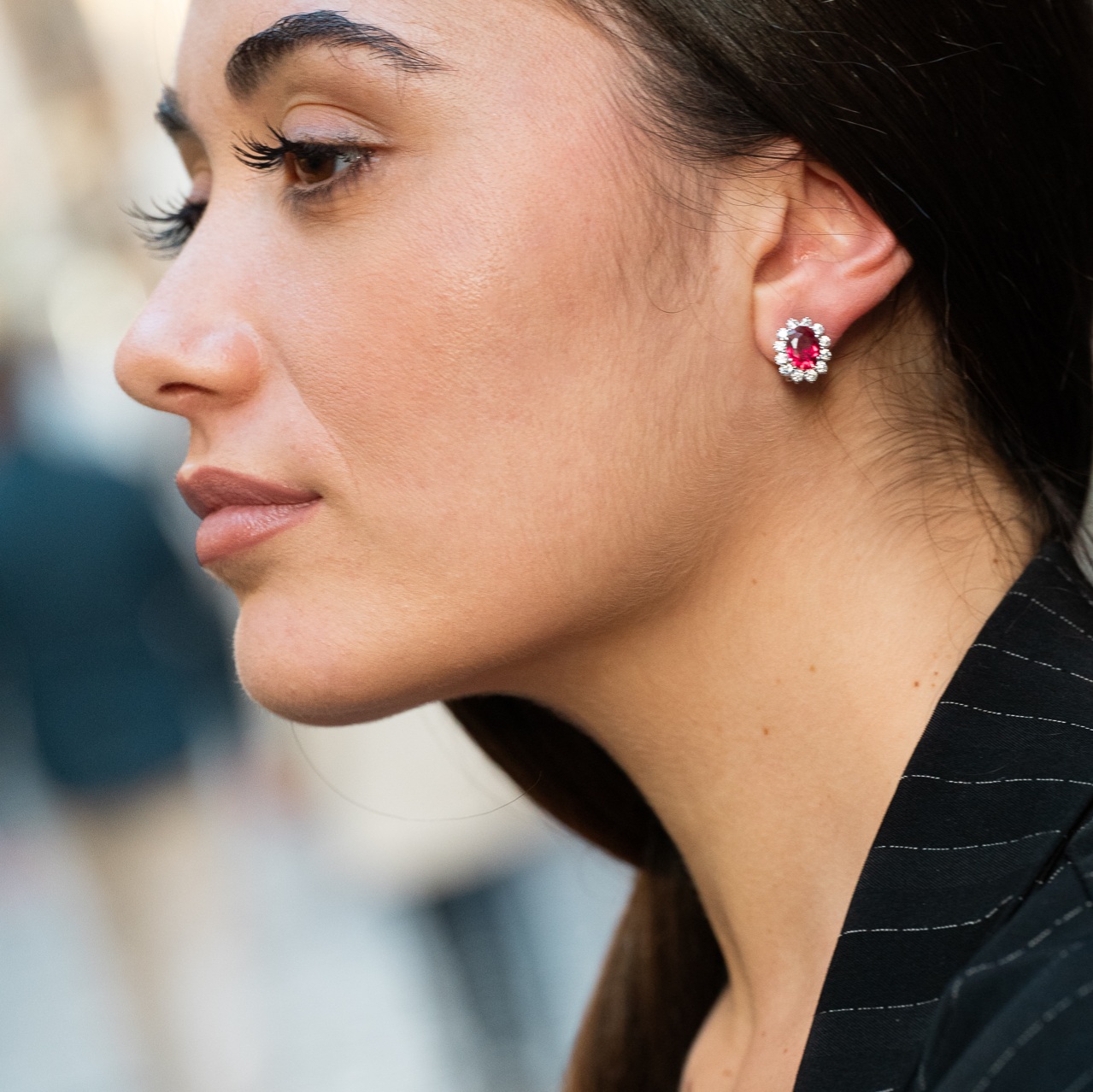 Orecchino margherita Kate rubino, in Ag925 rodiato, con pietra centrale taglio ovale simulante il Rubino rosso 9x7mm circa 3 carati e contorno di pietre taglio brillante simulanti il diamante da 3mm e 0,10 carati ognuna. Chiusura con perno e omega. Dimensione circa 1,5cm.