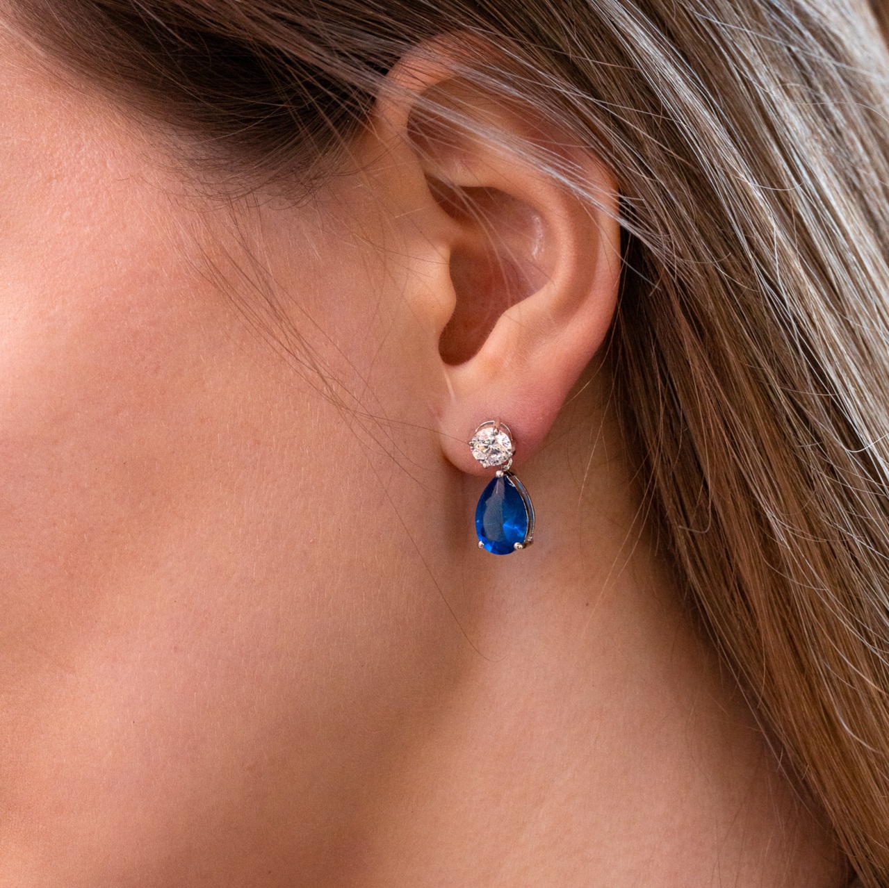 Orecchino pendente diamante e goccia zaffiro 4 carati, in Ag925 rodiato, con punto luce da 1 carato simulante il diamante e pietra taglio goccia simulante lo zaffiro blu da 4 carati. Orecchino con perno. Lunghezza pendente 2cm.
