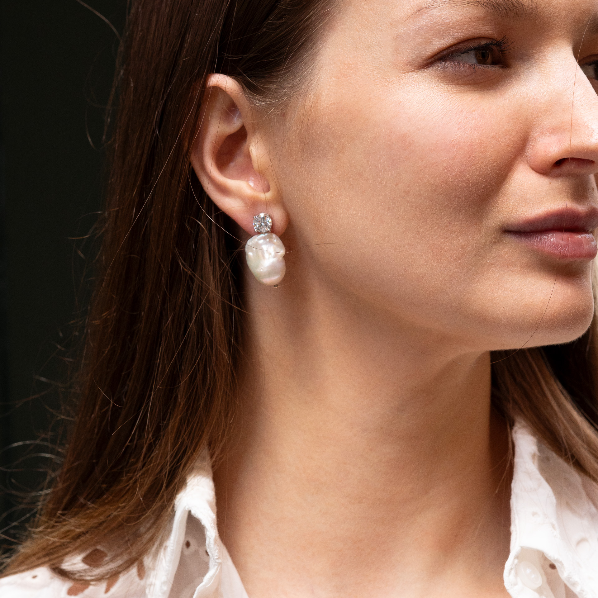 Orecchino punto luce diamante e perla barocca pendente, in Ag925 rodiato, con 1 pietra taglio brillante simulante il diamante da 1 carato e perla scaramazza, barocca, da 2cm. Lunghezza 3cm. La dimensione e la forma della perla può variare trattandosi di perle naturali australiane.